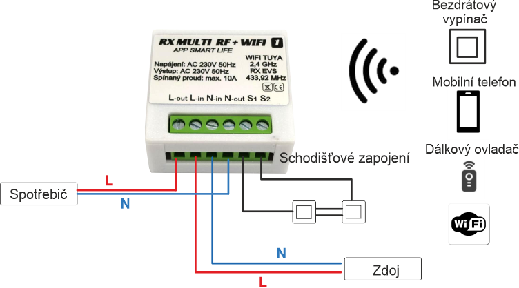 Bezdrátový 1-kanálový přijímač dálkového ovládání a ovládání pomocí aplikace mobilním telefonem.