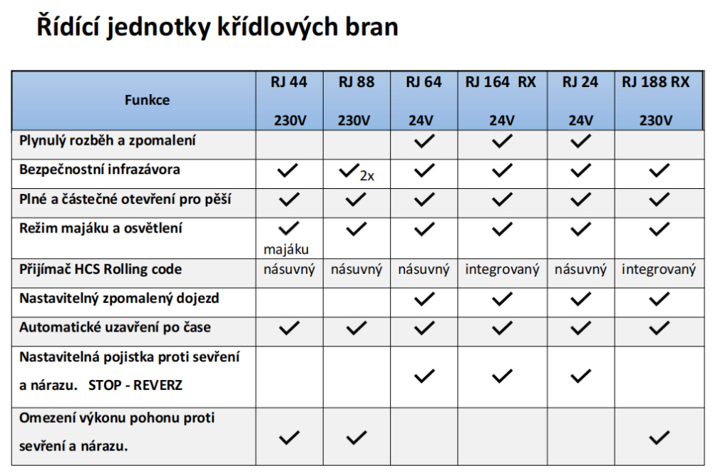 - výber riadiacej jednotky podľa výstupu pre motor 24V/DC alebo 230V/50Hz.